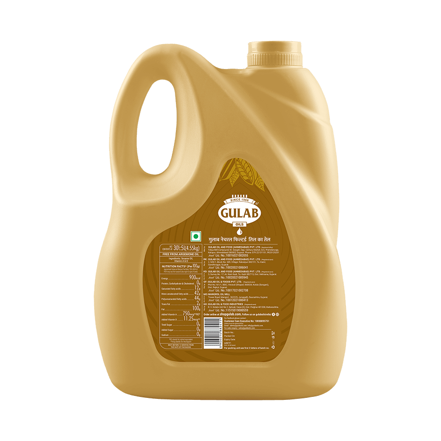 I am at Tamilnadu Kumbakonam (Temple City) and I have purchased Sesame oil for 5 liter in the oil contains purely because my local brand are essential oil or Argemone oil mix but Gulab oil without Argemone oil mixed Taste is so good compare my local brand