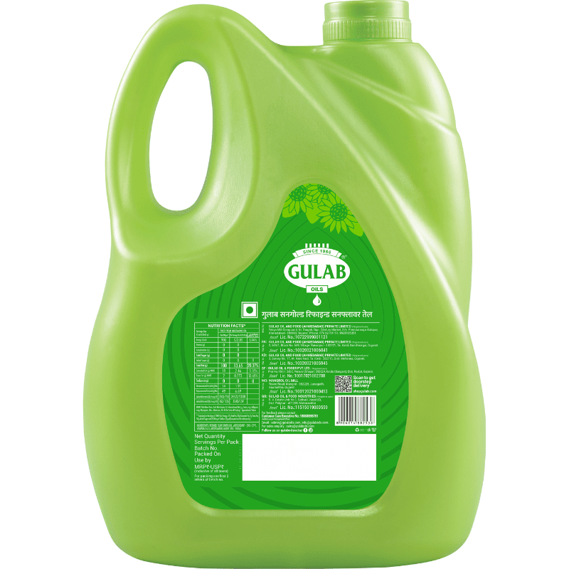 Inclusive of all taxes Ans: Gulab Sungold Refined Sunflower Oil is made from high-quality sunflower seeds and undergoes advanced refining processes to ensure purity, light texture, and a high smoke point. It is rich in Vitamin E and antioxidants, making it a healthy choice for frying, sautéing, and other cooking needs.