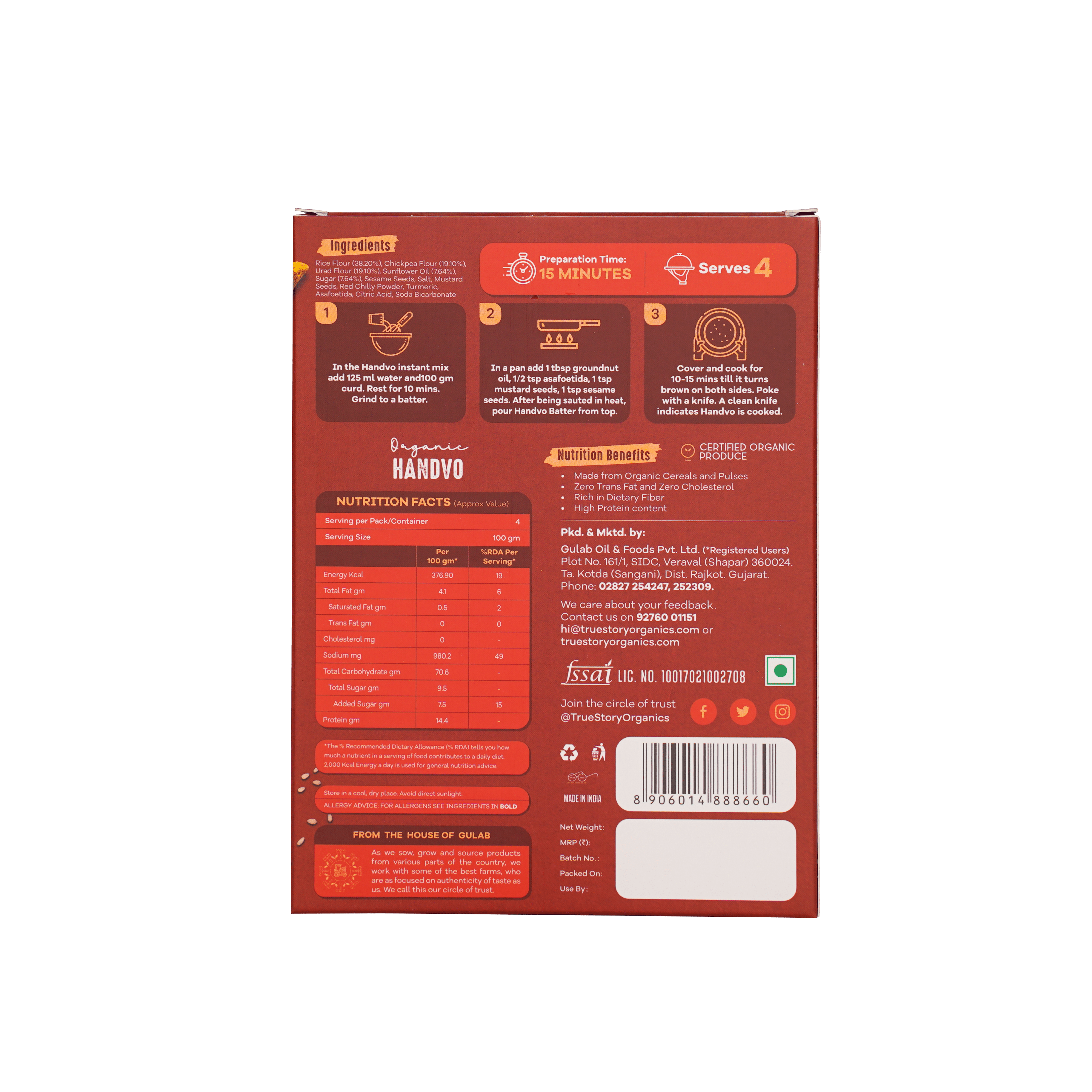 - True Story Organic Handvo: A savory Gujarati delicacy made from a blend of lentils, rice, and spices.